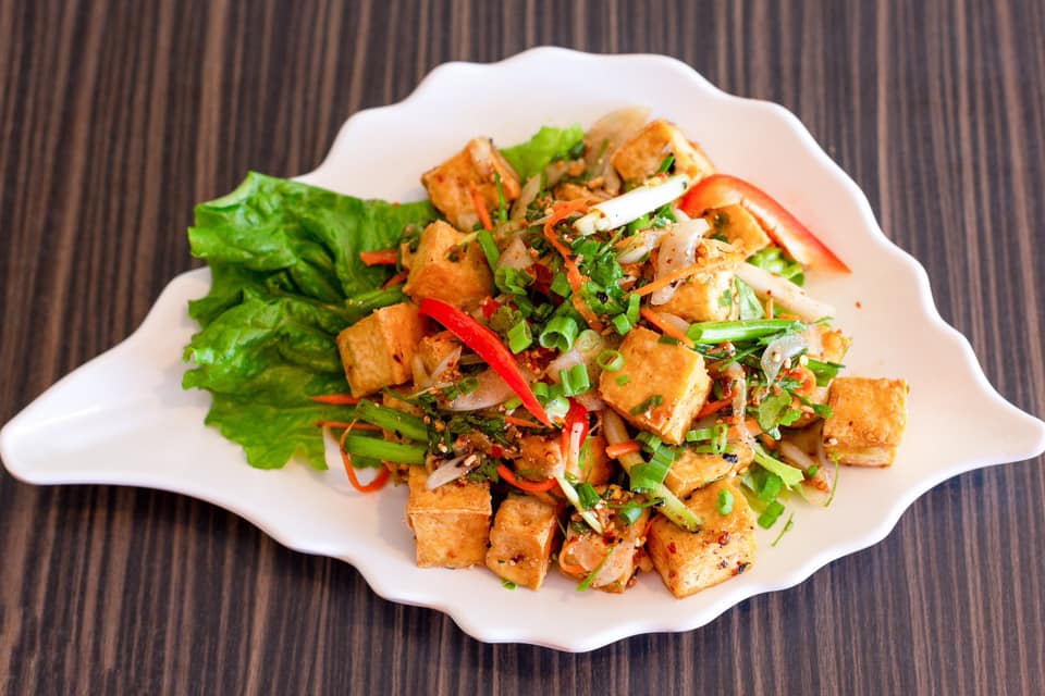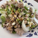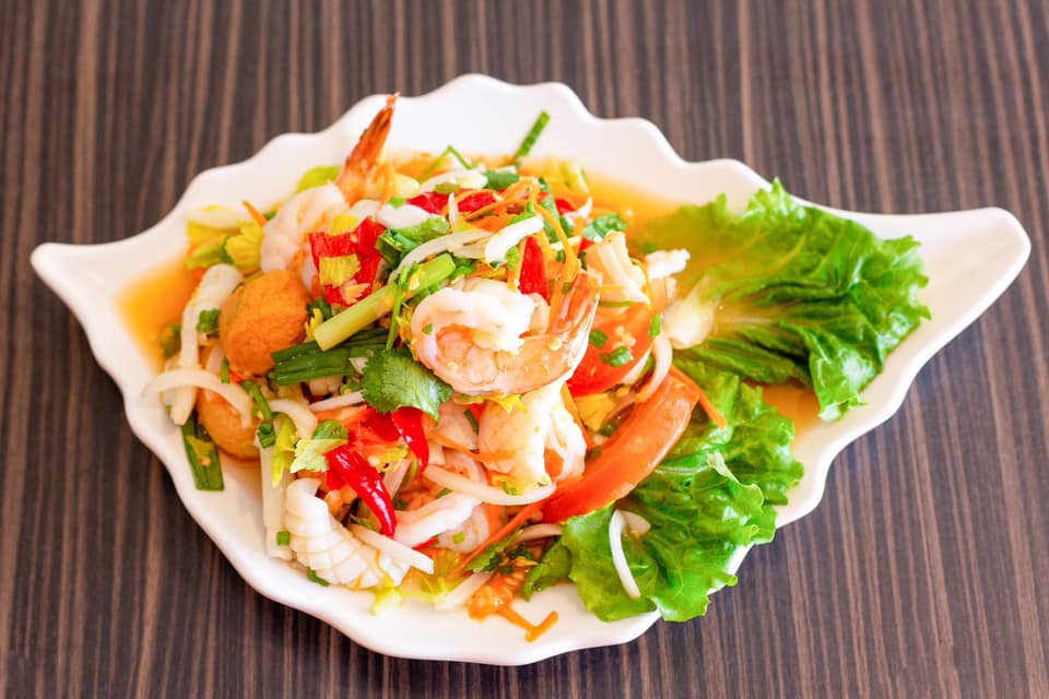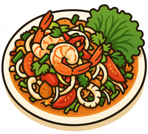 A bright and flavorful Thai salad made with fresh herbs, onions, tomatoes, cucumbers, and a tangy lime-chili dressing. Served chilled for a refreshing bite, with your choice of protein.